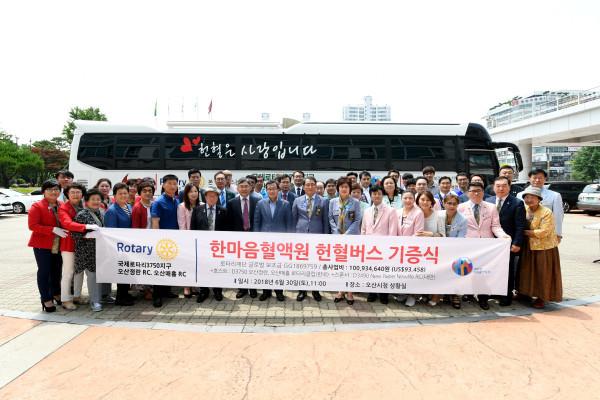 국제로타리3750지구 경기 오산 정란·매홀 로타리클럽은 지난 30일 시청에서 김태정 부시장과 천기택 3750지구 총재, 황유성 혈액원장 등이 참석한 가운데 ‘헌혈버스 기증식’을 개최했다. 사진은 기증한 헌혈버스 앞에서 기념촬영을 하는 관계자들의 모습. (사진제공=오산시청)