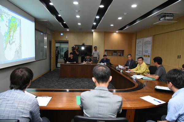 류경기 중랑구청장은 1일 오전, 중랑구재난안전대책본부에서 북상하는 제7호 태풍 ‘쁘라삐룬’에 대한 상황보고를 받았다. 사진은 류 구청장(가운데)이 주민 피해가 발생하지 않도록 체계적이고 신속한 대처를 지시하는 모습. (사진제공=중랑구청)