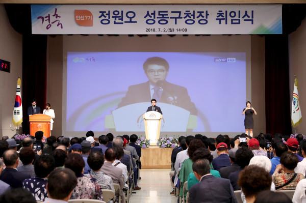 성동구는 2일 오후 2시 구청 대강당에서 지역주민 대표와 유관기관 관계자, 직능단체 회원, 사회적 관심계층 등이 참석한 가운데 ‘민선7기 구청장 취임식’을 개최했다. 사진은 정원오 구청장이 취임사를 하는 모습. (사진제공=성동구청)