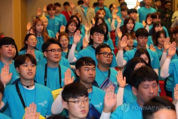 3일 전남 장성군 장성읍 장성문화예술회관에서 농촌재능나눔 캠프 발대식이 열려 참가 대학생이 선서를 하고 있다.