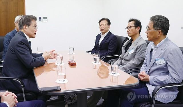 문재인 대통령이 3일 오후 서울 중구 옛 서울역사 ‘문화역서울284’에서 열린 ‘3.1 운동’ 및 ‘대한민국임시정부 수립 100주년’기념사업추진위원회 출범식에 앞서 열린 간담회에서 김명환 민주노총 위원장(오른쪽에서 두번째), 김주영 한국노총 위원장(맨 오른쪽)과 만나 환담하고 있다.