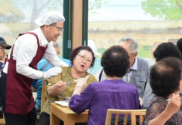 류경기 중랑구청장(왼쪽)이 첫 출근일인 지난 2일 오전, 면목2동에 소재한 중랑노인종합복지관을 방문해 노인들에게 직접 점심식사를 나눠준 후, 이야기를 나누고 있다. (사진제공=중랑구청)