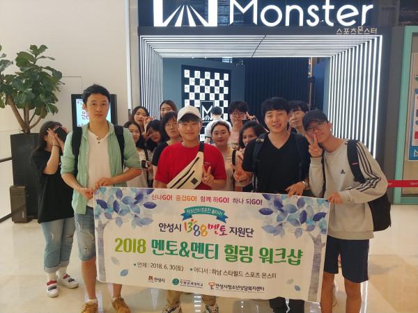최근 경기 안성시청소년상담복지센터는 하남 스포츠몬스터에서 대학생 멘토와 청소년 멘티 등이 참석한 가운데 ‘2018년 1388멘토지원단 멘토&멘티 힐링 워크숍’을 진행했다. 사진은 힐링 워크숍에 참여한 멘토·멘티들이 기념촬영을 하는 모습. (사진제공=안성시청)