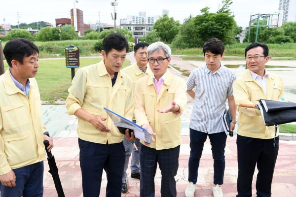 곽상욱 경기 오산시장은 지난 2일 오전 현충탑 참배를 시작으로 제7호 태풍 ‘쁘라삐룬’의 북상에 따라 재해위험지역 현장을 시찰하는 것으로 민선7기 업무를 시작했다. 사진은 지역내 재해위험지역을 방문한 곽 시장 등의 관계자들이 논의하고 있는 모습. (사진제공=오산시청)