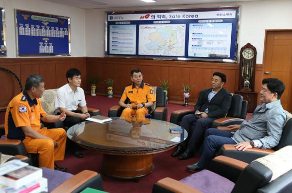 박현구 경기 연천소방서장은 3일 민선7기 출범을 기념해 군민의 안전을 위해 힘써준 소방 공무원의 노고를 격려하고자 소방서를 방문한 김광철 연천군수를 접견했다. 사진은 최 서장과 김 군수 등 관계자들이 환담을 나누고 있는 모습. (사진제공=연천소방서)