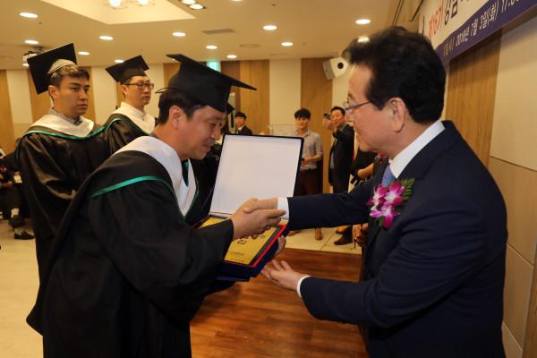 3일 정순균 서울 강남구청장이 도곡동 브라이드밸리에서 열린 ‘제16기 강남 외식산업최고경영자과정’수료식에 참석했다. 사진은 정 구청장(오른쪽)이 과정을 마친 한 수료생에게 수료패와 감사장을 수여하고 있는 모습. (사진제공=강남구청)