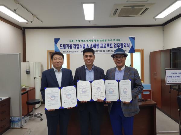 최근 서울 강남구가 청장년 일자리 지원의 일환으로 역삼1동 주민센터, 역삼1동보장협의체, 서울강남고용복지+센터 3자 간 업무협약을 체결하고 ‘드림키움 취업스쿨’과 ‘소확행 프로젝트’를 실시한다. 사진은 관계자들이 협약 후 기념촬영을 하고 있는 모습. (사진제공=강남구청)