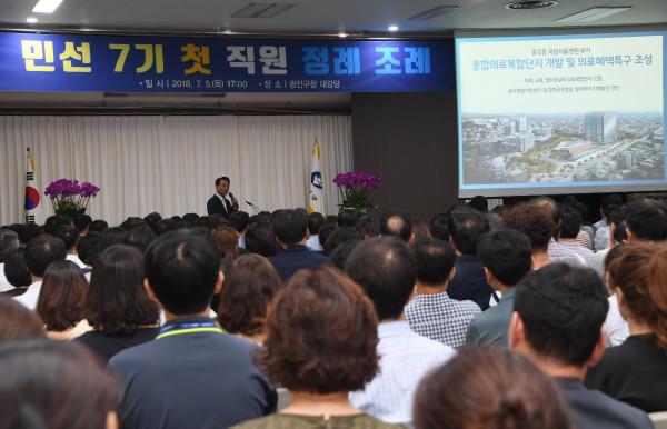 김선갑 광진구청장은 5일 오후 5시 구청 대강당에서 민선7기 첫 직원 정례조례를 열어 직원에게 PPT를 활용한 ‘광진 비전’을 발표하고 있다. 광진 변화를 위한 비전 발표 자리에서 김 구청장은 지역가치, 일자리, 복지, 안전, 교육, 문화, 체육, 행정 8대 정책과 방향, 68개 사업을 제시했다. (사진제공=광진구청)