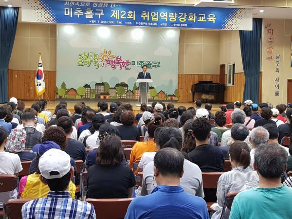 인천 미추홀구는 5일 구청 대회의실에서 ‘2018년 제2회 취업역량강화교육’을 실시했다. 사진은 교육에 참석한 김정식 구청장이 인사말을 하는 모습. (사진제공=미추홀구청)