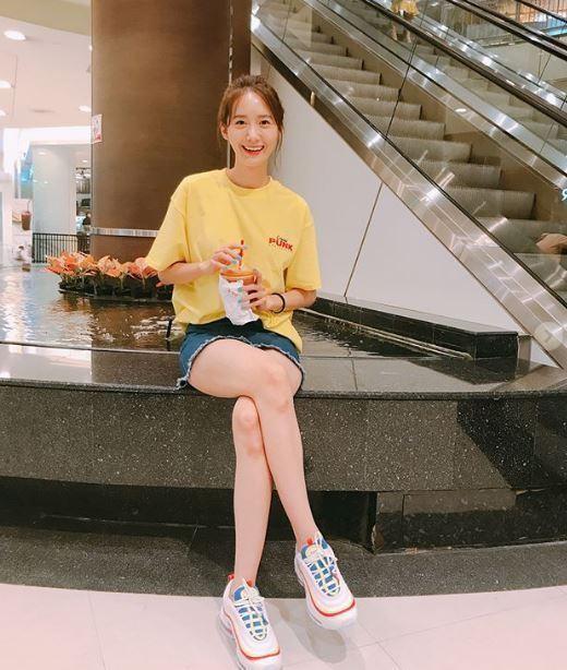 공개된 사진에는 노란색 반팔 티셔츠에 짧은 청반바지를 입고 운동화를 신은 윤아 모습이 담겼다. 특히 음료수를 들고 환하게 웃고 있는 그는 중학생이라고 해도 믿을 정도로 동안 외모를 자랑했다.