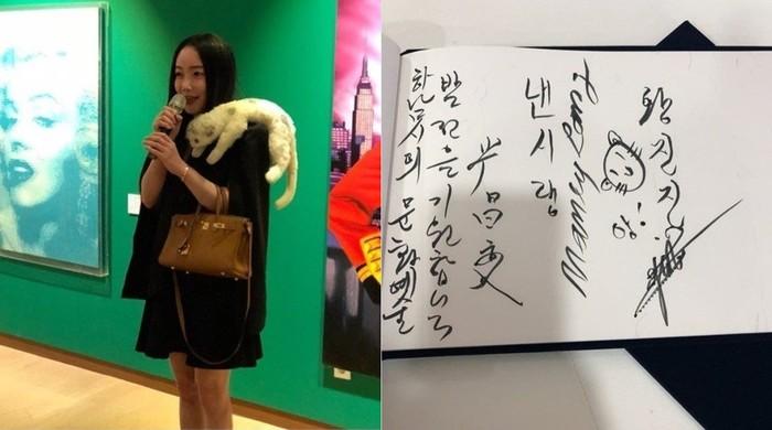 또 낸시랭과 남편 왕진진이 남긴 방명록에는 귀여운 이모티콘과 자신이 즐겨쓰는 '앙!'을 써 넣어 시선을 끌기도 했다.