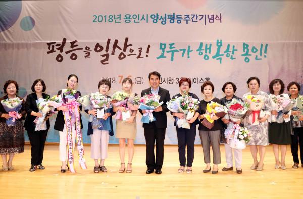 경기 용인시는 '양성평등주간'을 맞이해 지난 6일 시청 에이스홀에서 기념식을 개최하고, 양성평등문화 확산에 기여한 유공자 36명에 대해 표창을 수여했다. 사진은 백군기 시장과 양성평등 유공자들이 기념촬영을 하는 모습. (사진제공=용인시청)