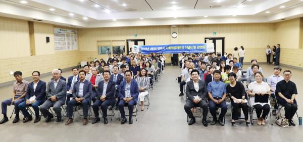 지난 7일 경기 평택시가 시청 대회실에서 200여명의 사회적경제 관계자가 참여한 가운데 ‘2018년 제5회 평택시 사회적경제 주간 기념식 및 강연회’를 개최했다. 사진은 기념식에 참여한 참가자들이 기념촬영을 하고 있는 모습. (사진제공=평택시청)