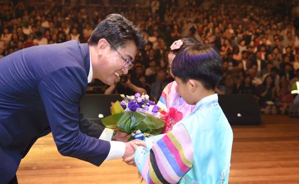 오승록 서울 노원구청장이 지난 6일 오전 10시 노원구민회관 대강당에서 ‘민선7기 취임식’을 개최하고, ‘자연과 문화속으로! 힐링 도시 노원’이란 슬로건 아래 구정 목표를 발표했다. 사진은 취임식에서 화동들로부터 꽃다발을 받는 오 구청장의 모습. (사진제공=노원구청)