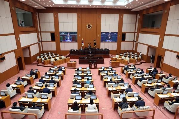 10일 오전 부산시의회 본회의장에서 시의원들이 제8대 부산시의회 전반기 의장단을 선출하고 있다.