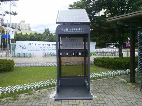 | ▲ 태양광을 활용한 ‘휴대폰 배터리 무료 충전기’의 전경. (사진제공=구리시청) | ||