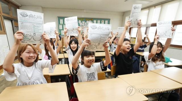 10일 오전 경기도 수원시 장안구 영화초등학교에서 열린 방학식에서 5학년 학생들이 방학 안내장을 들어 보이며 즐거워하고 있다.