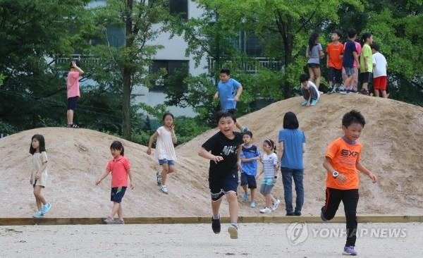 11일 서울 중랑구 신현초등학교에 처음으로 개장한 '꿈을 담은 놀이터'에서 어린이들이 흙더미가 쌓인 '바람의 언덕'에 올라 뛰어놀고 있다. 이 학교 '꿈을 담은 놀이터'는 학생들이 설계아이디어를 내고 감리에 참여하는 등 조성 전과정에 학생들이 참여했다.