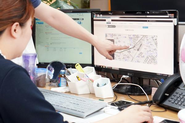 | ▲ 동대문구청 직원들이 구청 홈페이지에서 ‘빗물받이 지도’를 보고 있다. (사진제공=동대문구청) | ||
