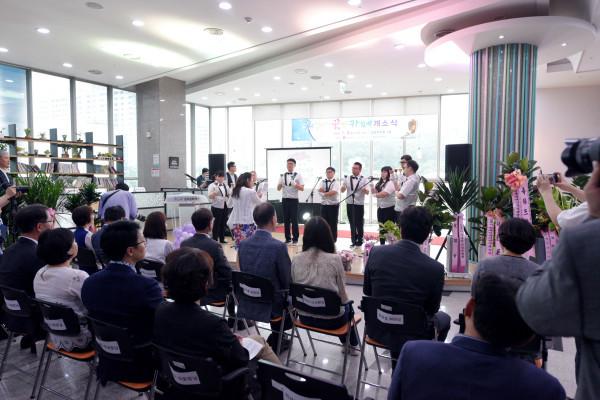 경기 김포시 장애인직업재활시설인 '밀알꿈씨'가 지난 9일 사우동 김포아트홀 2층에 '꿈앤카페'를 설치하고 정하영 김포시장을 비롯한 장애인 단체장, 복지 시설장 등을 초청해 개소식을 열었다. 사진은 개소식에서 지적장애인으로 구성된 '레인보우 핸드벨팀' 팀이 핸드벨 공연을 펼치는 모습. (사진제공=김포시청)