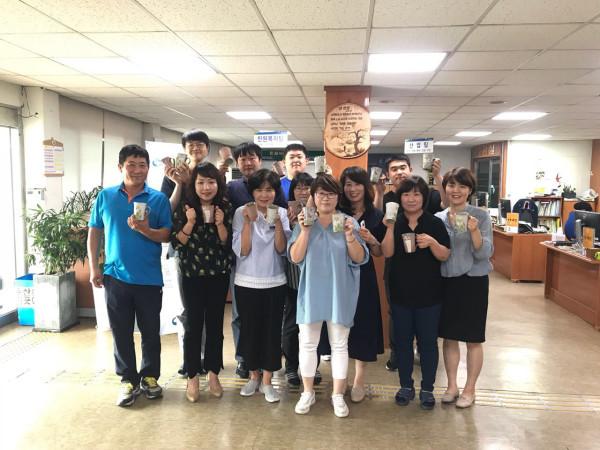 경기 여주시 점동면사무소 직원들은 최근 일회용품의 사용을 줄이며 환경보호에 앞장서자는 취지에서 개인컵을 사용하고 있다. 사진은 면사무소 직원들이 자신이 사용하고 있는 개인 컵을 들고 기념촬영을 하는 모습. (사진제공=여주시청)