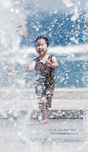 부산에 폭염주의보가 내려지는 등 전국적으로 본격적인 무더위가 시작된 11일 오후 부산 서구 송도해수욕장 분수대에서 한 어린이가 더위를 식히고 있다.