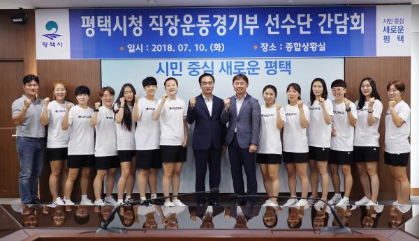 지난 10일 정장선 경기 평택시장이 시청 종합상황실에서 전국·국제대회에서 우수한 성적을 거둔 시청 직장운동경기부 지도자와 선수들의 노고를 격려하고, 선수단의 고충과 건의 사항을 경청했다. 사진은 정 시장(가운데)이 선수단과 함께 기념촬영을 하고 있는 모습. (사진제공=평택시청)
