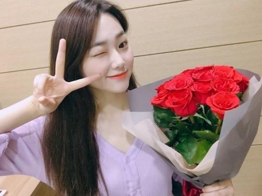사진 속에는 빨간 장미꽃다발을 들고 윙크를 한 채 귀여운 브이(V) 포즈를 취하고 있는 미나의 상큼발랄한 모습이 담겨 있어 시선을 사로잡는다.