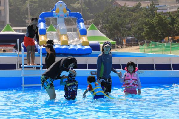 친환경 완도 신지명사십리 해수욕장에 풀장과 에어바운스, 슬라이드 등 다양한 시설이 설치돼 신나게 물놀이를 즐길 수 있게 됐다. 이용 시간은 오전 9시30분~오후 5시30분까지이며, 요금은 대인 5000원, 소인 3000원이다. 사진은 12일 해수욕장을 찾은 가족들이 풀장에서 물놀이를 즐기는 모습.(사진제공=완도군청)