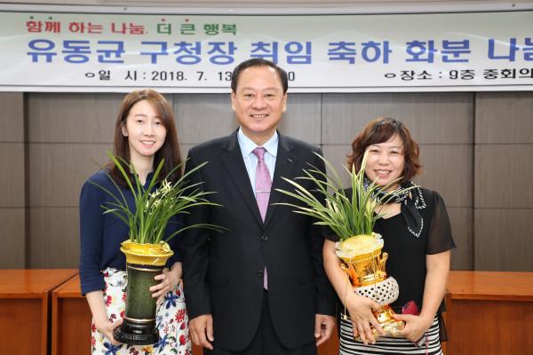 유동균 마포구청장은 13일 오전 취임 축하의 의미로 받은 난을 직원들에게 저렴한 가격으로 판매해 얻은 310여만원 상당의 수익금을 마포인재육성장학재단에 장학금으로 전액 기부했다. 사진은 유 구청장(가운데)이 직원들과 기념촬영을 하는 모습.(사진제공=마포구청)
