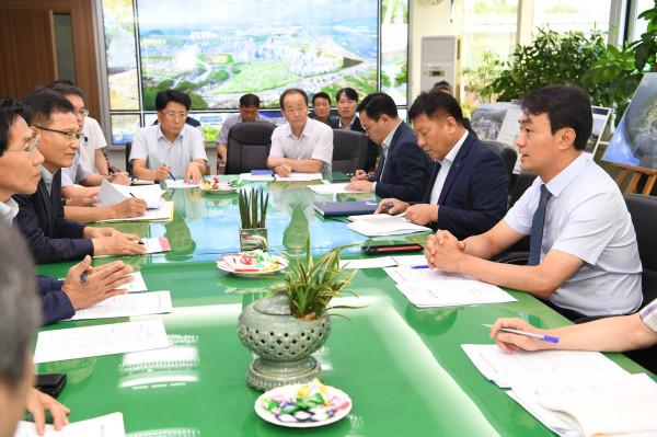 12일 경기 하남시 내 ‘에일린의 뜰’ 아파트 단지에서 발생한 적수 현상과 관련해 김상호 하남시장이 13일 비상대책회의를 열고 관계 공무원 및 하남도시공사 관계자들과 재발 방지대책을 논의하고 있다.(사진제공=하남시청)