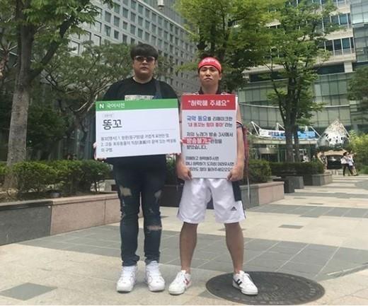 사진을 보면 유세윤이 마스크를 쓴 채 자신만의 개성을 한 껏 담은 시위를 하고 있는 모습이 담겨 있다.