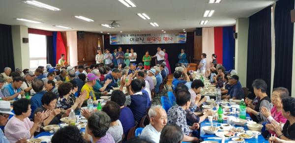 경기 안성시 안성1동 새마을부녀회 및 새마을지도자협의회는 13일 동주민센터 대회의실 및 다목적실에 지역노인 250여명을 초청해 ‘어르신 복달임 행사’를 개최했다. 사진은 행사에 참석한 노인들이 식사를 하는 모습.(사진제공=안성시청)