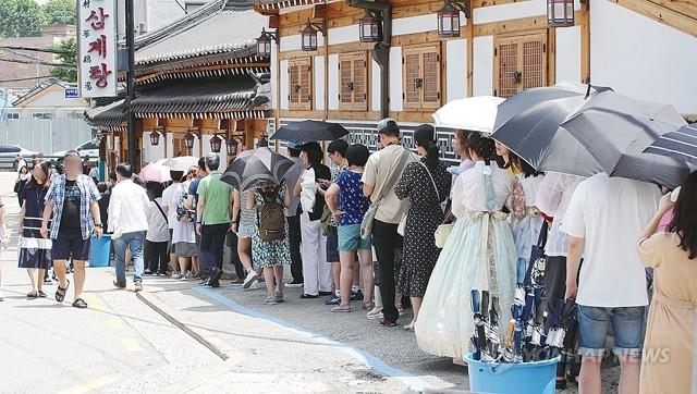 초복을 이틀 앞둔 15일 오후 서울 종로구의 한 유명 삼계탕 집 입구가 폭염을 이겨내려는 시민들과 관광객들로 붐비고 있다.