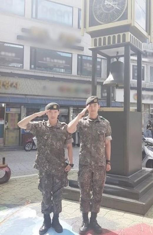 사진 속 준케이 택연은 군복을 입고 어깨동무를 한 채 환하게 웃고 있다. 또 다른 사진에서는 각 잡힌 경례 포즈로 카메라를 응시하고 있어 시선을 사로잡는다.