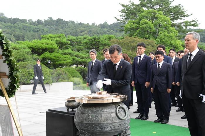 제10대 서울시의회 신원철 의장을 비롯한 의원들이 지난 12일 오전 국립서울현충원을 찾아 현충탑을 참배하며 순국선열과 호국영령의 뜻을 기리고, 1000만 서울시민의 안전과 행복을 위한 의정활동에 박차를 가하겠다는 각오를 다졌다. 사진은 현충탑 참배를 하는 신 의장 등 의원들의 모습.(사진제공=서울시의회)