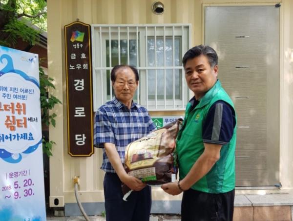 서울 성동구 금호1가동 새마을지도자협의회가 지난 13일 지역내 저소득 취약계층을 위한 ‘사랑의 쌀’ 나눔 활동을 펼쳤다. 협의회는 2007년부터 10년째 쌀을 나눠왔다. 사진은 관계자들이 사랑의 쌀을 들고 기념촬영을 하는 모습. (사진제공=성동구청)