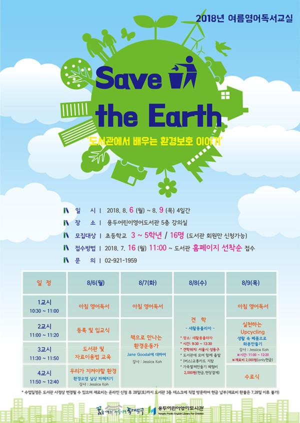 16일 구에 따르면 이번 영어독서교실은 ‘Save the Earth’라는 주제로, 지역내 초등학교 3~5학년을 대상으로 오는 8월6~9일 4일간 ▲영어 독서 및 독후감 쓰기 ▲환경보호 수업 ▲서울새활용플라자 견학 등의 프로그램을 실시한다.
