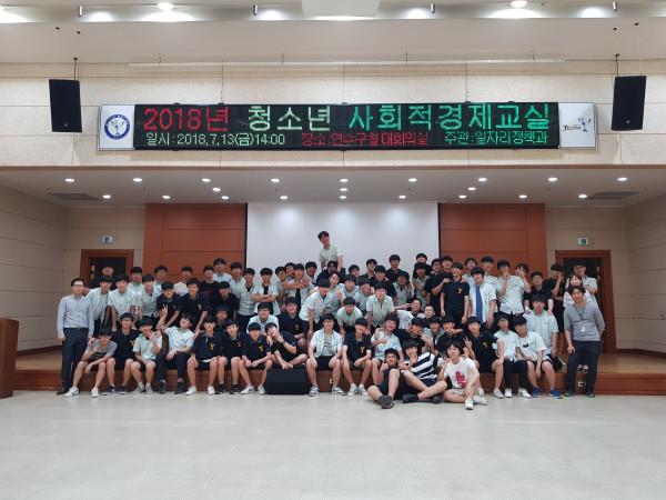 인천 연수구는 지난 13일 구청 대회의실에서 연수고 학생 80여명이 참석한 가운데 ‘2018년 연수구 청소년 사회적경제교실’을 개최했다. 사진은 참여한 학생들이 기념촬영을 하는 모습. (사진제공=연수구청)