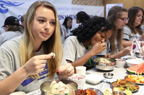 16일 서울 성북구 한성대학교 창의관에서 열린 2018 국제여름학교 초복 맞이 보양식 체험행사에서 외국인 학생들이 삼계탕을 맛보고 있다.