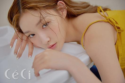 공개된 화보 속 청하는 리본 스트랩과 레이스 디테일이 돋보이는 머스터드색 원피스를 입고 카메라를 향해 몽환적인 눈빛을 발산했다.