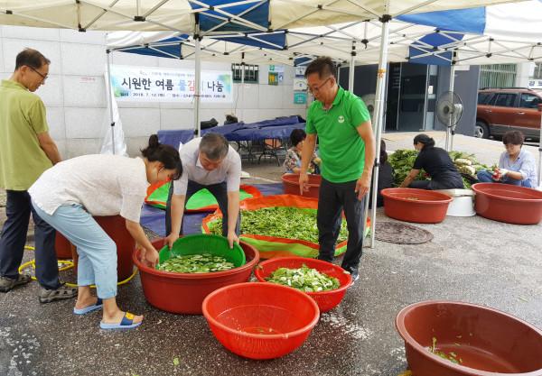 중랑구는 최근 홀몸노인·장애인 등 폭염 취약계층에게 건강한 여름을 선물하고자 열무물김치 130통을 직접 담가 나누는 행사를 진행했다. 신내1동 행복나누리협의체가 주관한 열무김치 담그기는 협의체위원, 복지통장 등 20여명이 참여해 직접 열무를 씻고 버무리며 이웃사랑을 실천했다. (사진제공=중랑구청)