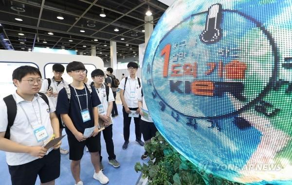 18일 서울 서초구 양재동 aT센터에서 열린 2018 대한민국 기후기술대전에서 한국에너지기술연구원 부스를 방문한 학생들이 지구온난화를 막기 위한 연구에 대해 설명 듣고 있다.