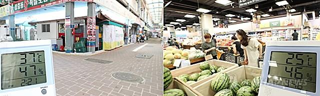 폭염경보가 내려진 18일 오후 세종시 한 전통시장(왼쪽)과 대형마트 모습. 전통시장은 한산한 반면 대형마트에서는 방문객들이 냉방을 즐기며 쇼핑을 하고 있다.