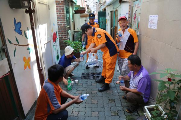 지난 17일 서울 종로소방서가 연일 지속되는 35°C 안팎의 폭염으로 온열 질환자가 늘어날 것에 우려, 재난취약계층 밀착 관리를 위해 돈의동 및 창신동 쪽방촌에서 폭염119안전캠프를 운영했다. 사진은 소방대원들이 주민들에게 시원한 생수를 나눠주고 있는 모습. (사진제공=종로구소방서)