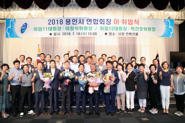 경기 용인시 주민자치연합회는 제12대 회장으로 박건호 동부동 주민자치위원장을 선임하고, 18일 취임식을 개최했다. 사진은 취임식에 참석한 백군기 시장과 박 회장을 비롯한 30개 읍·면·동 주민자치위원장 등이 기념촬영을 하는 모습. (사진제공=용인시청)