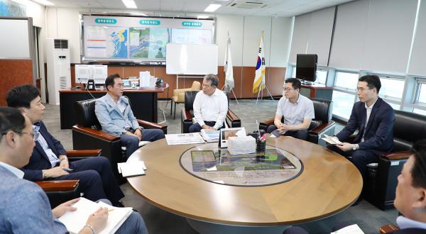 18일 정장선 경기 평택시장이 평택지방해양수산청, 평택직할세관, 평택해양경찰서, 경기평택항만공사를 방문해 기관별 건의사항 청취 등 자유로운 소통의 시간을 가졌다. 사진은 경기평택항만공사를 방문한 정 시장(왼쪽 세번째)이 관계자들과 함께 이야기를 나누고 있는 모습. (사진제공=평택시청)