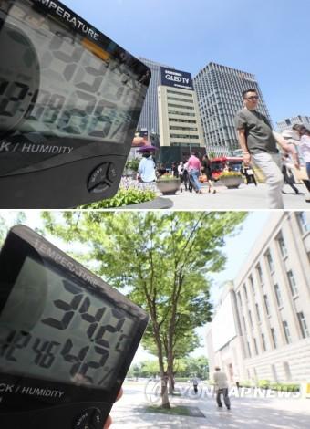 전국적으로 폭염특보가 계속되고 있는 19일 오후 서울 광화문 광장에서 온도계가 강한 햇볕과 바닥에서 반사되는 지열 등으로 인해 43.4도를 기록하고 있다(위 사진). 반면 서울광장 나무 그늘 아래서는 34.2도를 기록하고 있다. 온도는 시중에서 판매하는 디지털 온도계를 사용해 지상 50cm에서 10분가량 노출 시킨 뒤 측정하였다.