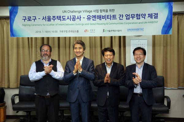 김인제 서울시의원은 지난 18일 구로구청 르네상스홀에서 열린 ‘유엔(UN) 챌린지 빌리지 업무협약 체결식’에 참석해 국내 최초로 시도되는 청년국제교류 복합주거시설인 챌린지 빌리지의 성공적 정착과 발전을 위해 협력하겠다고 약속했다. 사진은 협약식에 참석한 김 의원과 이성 구로구청장 등 관계자들의 모습. (사진제공=서울시의회)