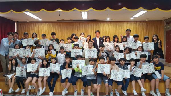 경기 양주시 회천2동은 19일 지역내 4개 초등학교(덕산초·덕계초·도둔초·회정초)에 통학로 교통안전지도 책자 500부를 배포했다. 사진은 학생들이 지도를 들고 기념촬영을 하는 모습. (사진제공=양주시청)